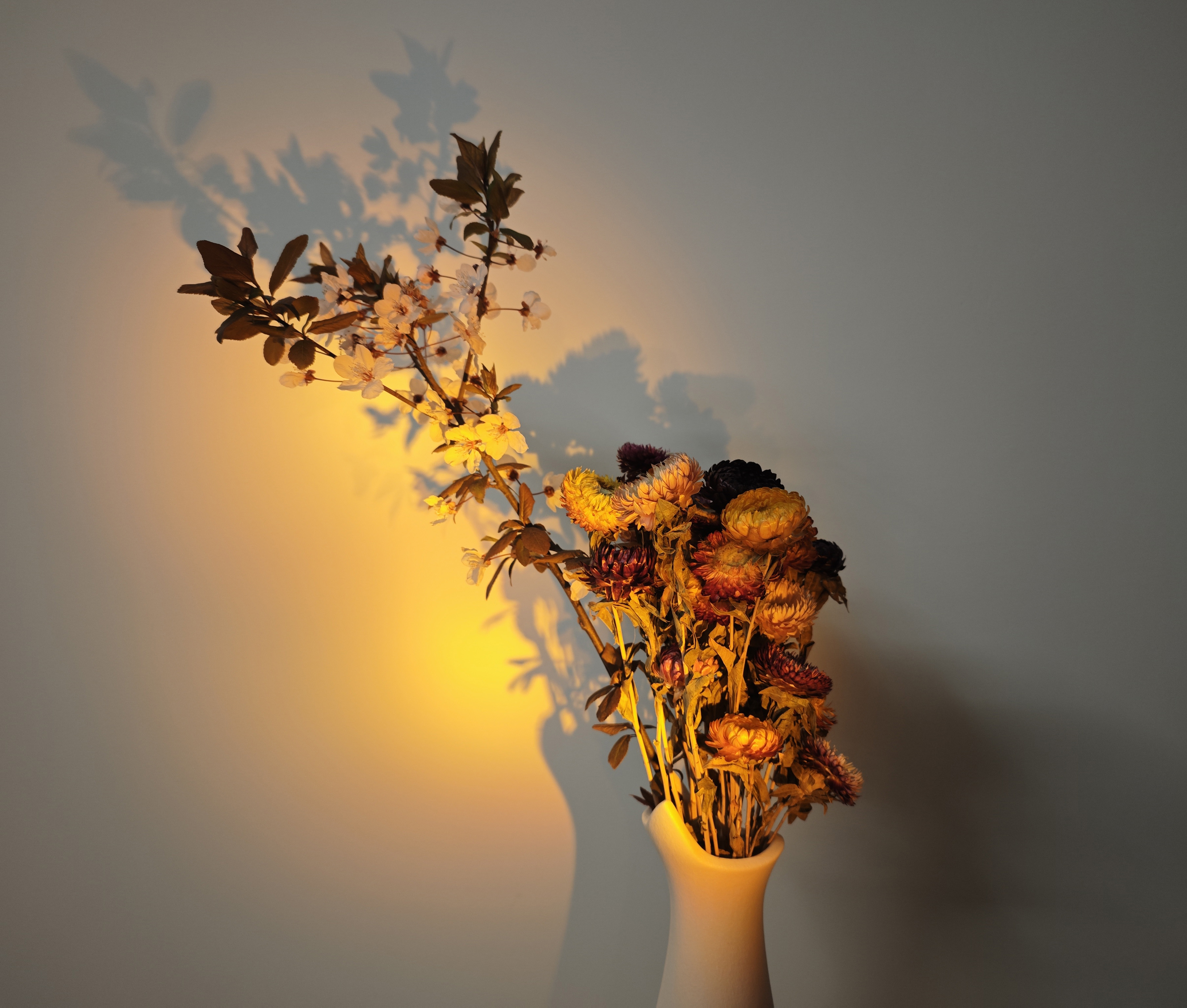 新家的一角:夜里下班后的氛围灯,猫耳花瓶,雏菊、梨花。